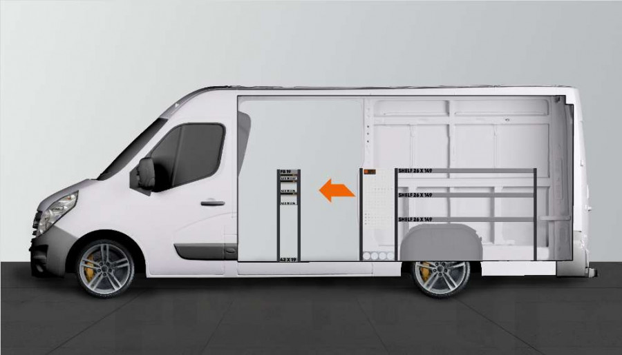 Moet u uw Opel Movano, Renault Master & Nissan NV400 L3 maximaliseren met een extra bedrijfswageninrichting? Dit is een bedrijfswageninrichting waarmee u meer laadruimte van uw wagen kunt behouden omdat deze 260 mm diep is. De bedrijfswageninrichting heeft aantal lades op geleiders met kogellagers in variërende afmetingen om verschillende opbergmogelijkheden te creëren. Deze kunnen worden aangevuld met ladeverdelers of inzetstukken om uw kleinere materialen netjes en opgeruimd te houden. De legplankruimte achter het ladeblok wordt vaak aangevuld met modulaire magazijn bakken. Het verdeelde maximale gewicht van de materialen in de lades op geleiders met kogellagers is 35 kg per lade. De binnen afmetingen van de lades zijn (mm) B-163, D-387, H-60 en H-130.
