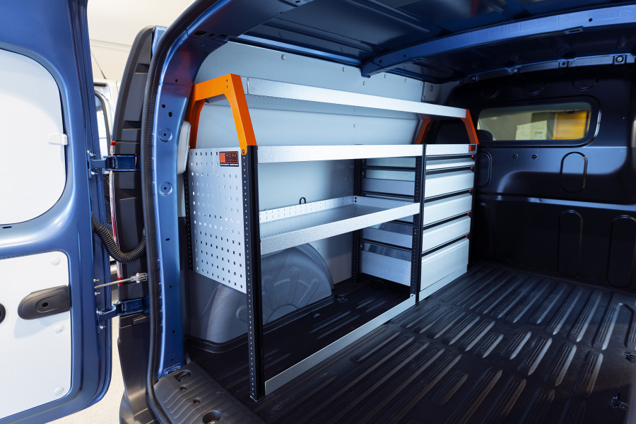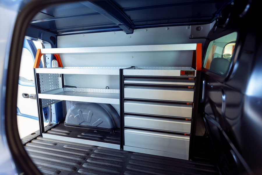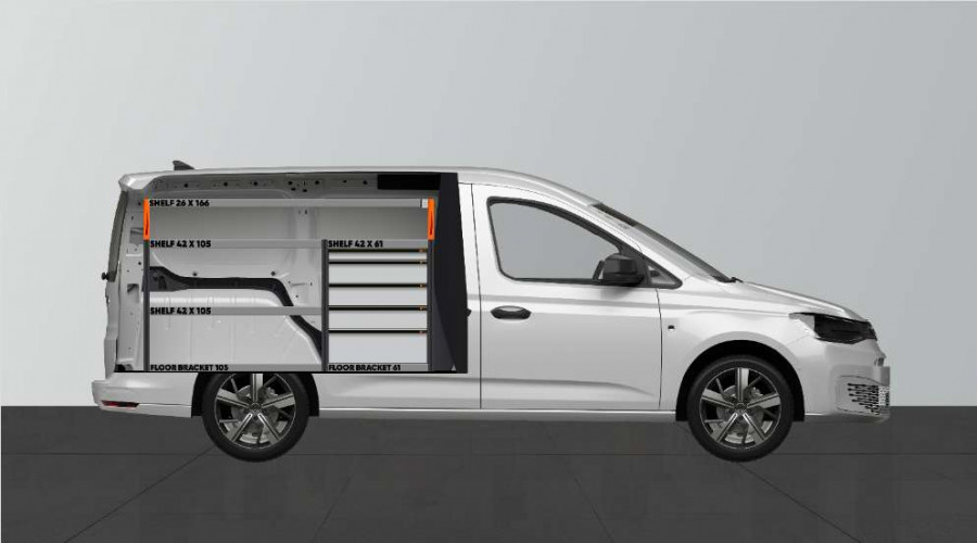 Deze bedrijfswageninrichting biedt veel opbergruimte met zowel legplanken als lades, geschikt voor de VW Caddy Cargo & Ford Connect L2.