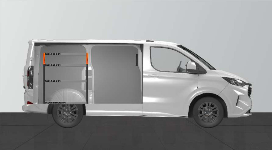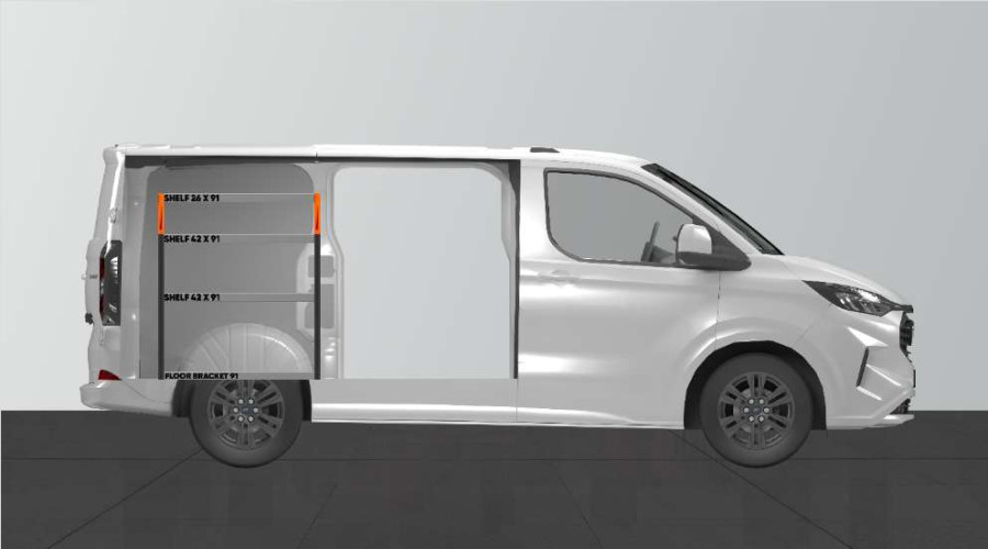 Een minder diepe bedrijfswageninrichting voor de laadruimte van uw Ford Custom & VW Transporter L1 met goede opbergmogelijkheden voor zowel assortiment koffers, gereedschappen en kleine onderdelen. De legplanken van de bedrijfswageninrichting met een diepte van 420 mm zorgen ervoor dat de meeste assortiment koffers die er op de markt zijn perfect passen. De bovenste legplank van 262,5 mm wordt vaak aangevuld met onze modulaire magazijnbakken om kleine accessoires een plekje te geven. De bedrijfswageninrichting is geschikt voor wagens met en zonder zijdeuren. Vergeet niet de gereedschapshouder op het eindstuk te gebruiken.