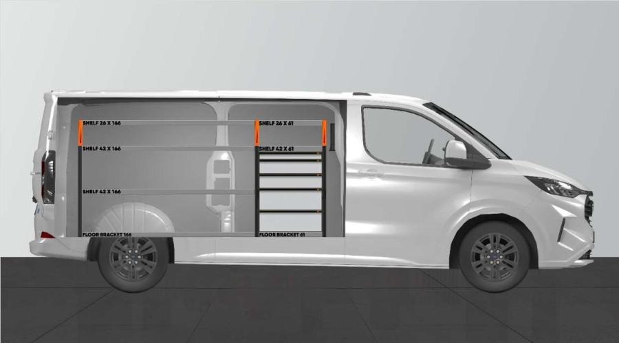 Dit is een van de meest populaire systemen voor de laadruimte van de Ford Custom & VW Transporter L2. De bedrijfswageninrichting biedt goede opbergmogelijkheden voor zowel assortiment koffers als gereedschappen, maar ook voor kleinere materialen. U krijgt een ladeblok met 5 lades in verschillende afmetingen, zodat alles zijn eigen plek krijgt. De lades op geleiders met kogellagers worden vaak aangevuld met onze nieuwe lade-inzetstukken en verdelers om een optimale indeling te creëren. Het aanvullen van het eindstuk met een smartbox is ook een populaire optie om de opbergruimte te optimaliseren.