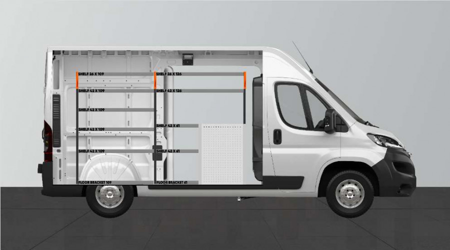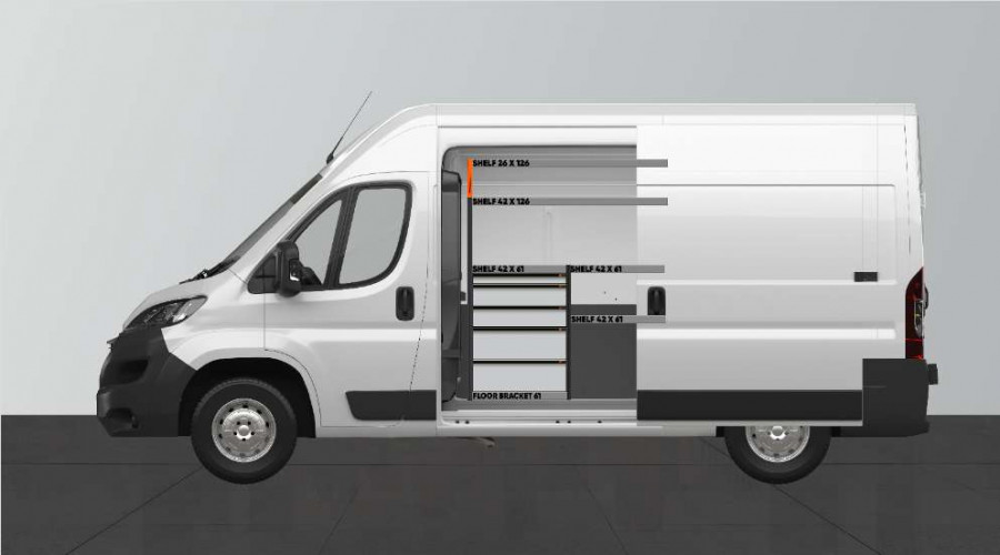 Deze bedrijfswageninrichting biedt veel opbergruimte met zowel legplanken als lades, geschikt voor de Proace Max, Boxer, Ducato, Jumper & Movano L2.