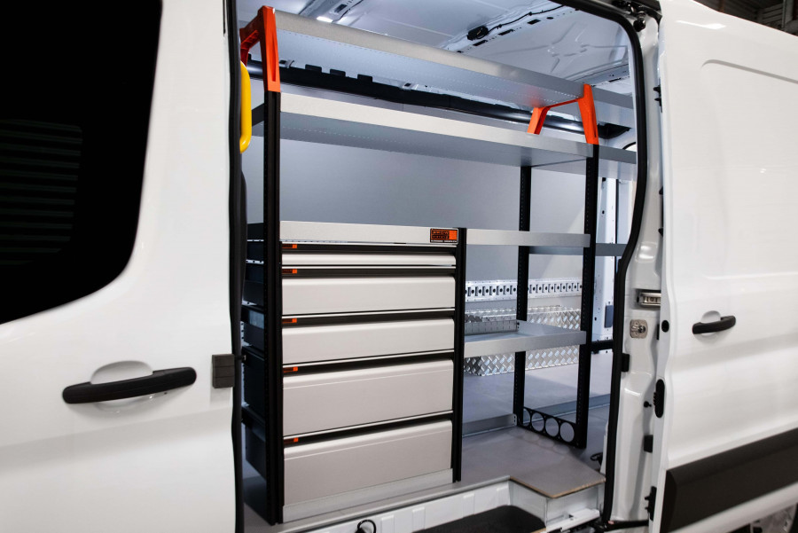 Populaire bedrijfswageninrichting met veel opbergmogelijkheden en lades voor de linkerkant van uw Ford Custom L1.