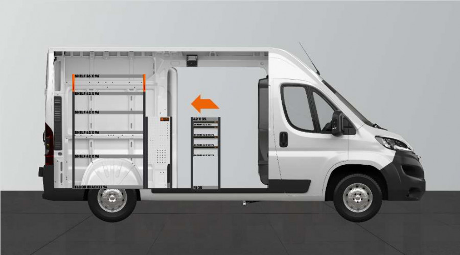 Een van de meest populaire bedrijfswageninrichting voor uw Proace Max, Peugeot Boxer, Fiat Ducato, Citroen Jumper 2010- & Opel Movano 2021- L2. De bedrijfswageninrichting biedt uiteenlopende opbergmogelijkheden, omdat de lades op de lades op geleiders met kogellagers een handige toegang bieden via de zijdeur, terwijl deze lades in de rijrichting kunnen worden uitgetrokken voor een beter overzicht. De lades kunnen worden aangevuld met ladeverdelers om zoveel mogelijk structuur aan te brengen voor kleinere materialen. Onze diepe legplanken bieden ook goede opbergmogelijkheden voor gereedschapkoffers en gereedschappen. Het maximale verdeelde gewicht van de materialen in de lades op geleiders met kogellagers is 35 kg per lade. De binnen afmetingen van de lades zijn (mm) B-308, D-387, H-60 en H-130.