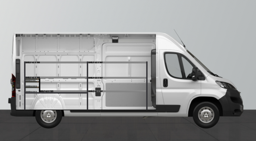 Een goedkope oplossing wanneer u lades op kogellagers wilt, maar ook opslagmogelijkheden in de vorm van schappen in uw Proace Max, Boxer, Ducato, Jumper L3H2. Deze inrichting is 420mm diep waardoor de meeste gereedschapstassen van tegenwoordig perfect in de schappen passen. De lades worden vaak aangevuld met onze nieuwe assortimentslades. Dit zorgt ervoor dat u kleiner materiaal gemakkelijk op kunt bergen.