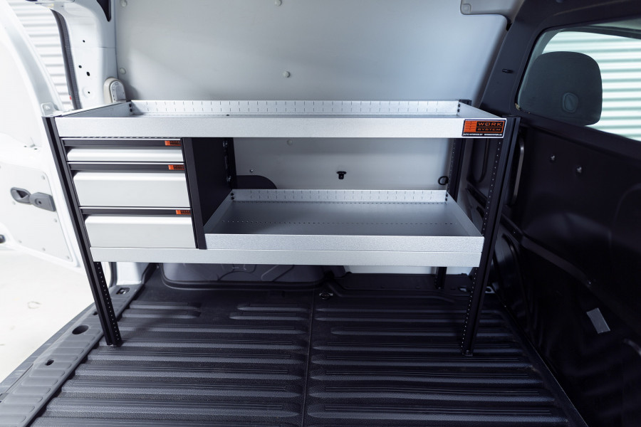 Een eenvoudige oplossing die populair is in servicewagens met zowel lades als legplanken voor de Citan Kangoo & Townstar L1.