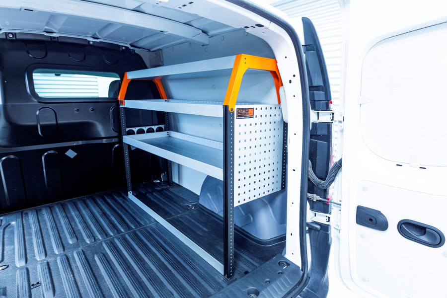 Een bedrijfswageninrichting voor de laadruimte van uw Mercedes Citan, Renault Kangoo & Nissan Townstar L1 met goede opbergmogelijkheden voor zowel assortiment koffers, gereedschappen en kleine onderdelen. De legplanken van de bedrijfswageninrichting met een diepte van 420 mm zorgen ervoor dat de meeste assortiment koffers die er op de markt zijn perfect passen De bovenste plank van 262,5 mm wordt vaak aangevuld met onze modulaire magazijnbakken om kleinere onderdelen een plekje te geven. De gereedschapshouder op het eindstuk is aan te vullen met extra accessoires, zoals haken of een smartbox.