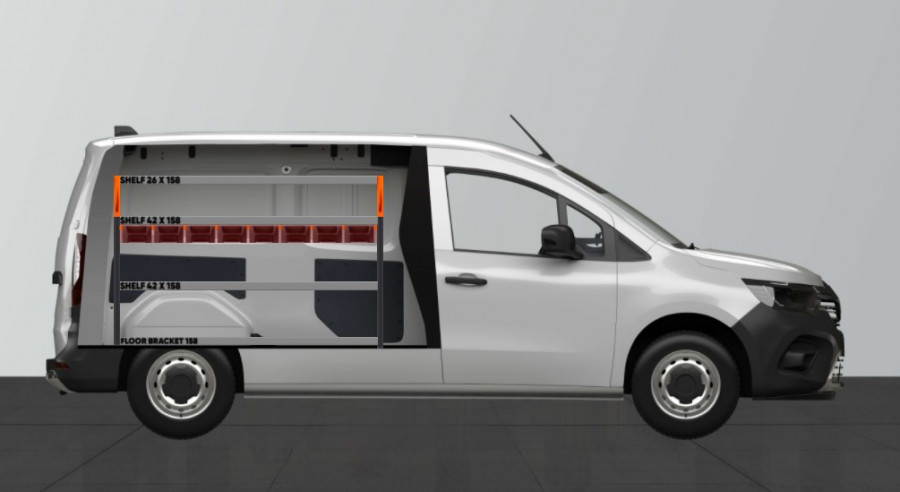 Een bedrijfswageninrichting voor iedereen die alles op orde wil hebben in een Kangoo, Citan, Townstar L2H1. Met deze inrichting is heeft 8 st nieuwe, slimme modulebakken. U kunt deze gemakkelijk naar voren halen dankzij onze handige rails. Dit kan gemakkelijk aangepast worden en verschoven worden met de schappen. Uiteraard biedt dit ook goede oplossingen voor uw gereedschapstassen, machines en materiaal dankzij de schappen die 420mm diep zijn.