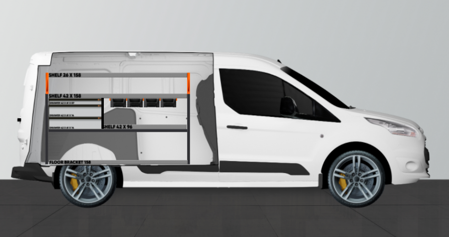 Dit is een van onze meest populaire bedrijfswageninrichtingen voor de Ford Connect L2H1. U krijgt hier goede opslagmogelijkheden voor uw gereedschapstassen, machines, verbruiksmateriaal en uw allerkleinste materialen. In deze inrichting zitten 5 st van onze nieuwe, slimme modulebakken op rails. En dit allemaal tegen de beste prijs op de markt. De lades met kogellagers worden vaak uitgebreid met onze nieuwe assortiment lades. Het uitbreiden van het systeem met onze nieuwe Smartbox is ook een populaire optie om op die manier nog meer opslagmogelijkheden te hebben. Het laadgewicht van de lades op kogellager rails is 35kg/st. De binnenmaat van de lades is (mm) B-579, D-387, H-60 en H-130.