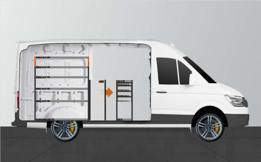 Een van de meest populaire bedrijfswageninrichting voor uw MAN TGE & Volkswagen Crafter L3. De bedrijfswageninrichting biedt uiteenlopende opbergmogelijkheden, omdat de lades op de lades op geleiders met kogellagers een handige toegang bieden via de zijdeur, terwijl deze lades in de rijrichting kunnen worden uitgetrokken voor een beter overzicht. De lades kunnen worden aangevuld met ladeverdelers om zoveel mogelijk structuur aan te brengen voor kleinere materialen. Onze diepe legplanken bieden ook goede opbergmogelijkheden voor gereedschapkoffers en gereedschappen. Het maximale verdeelde gewicht van de materialen in de lades op geleiders met kogellagers is 35 kg per lade. De binnen afmetingen van de lades zijn (mm) B-308, D-387, H-60 en H-130.