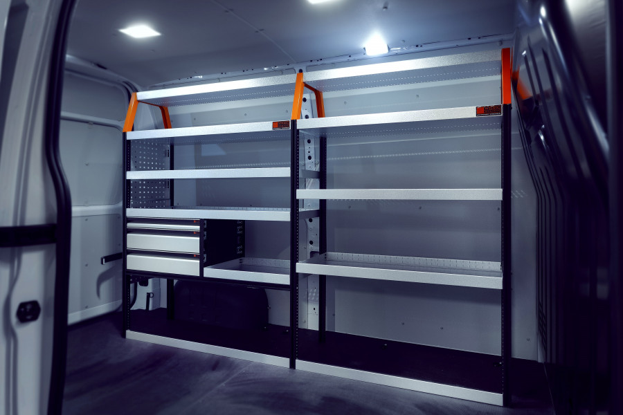 Met een combinatie van lades en legplanken is dit een zeer populaire bedrijfswageninrichting die geschikt is voor de Man TGE & VW Crafter L3.