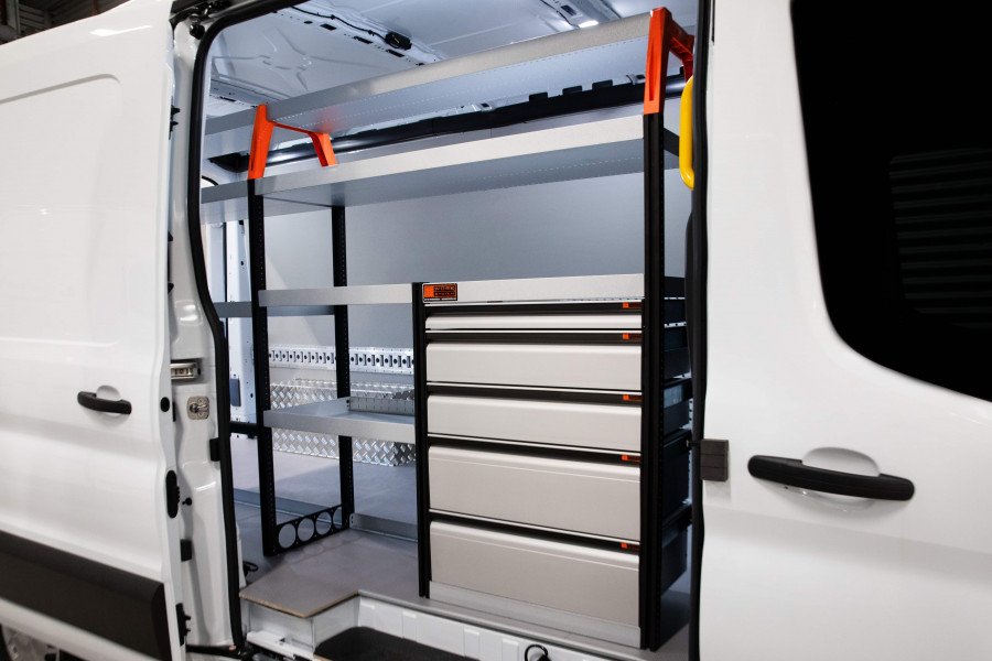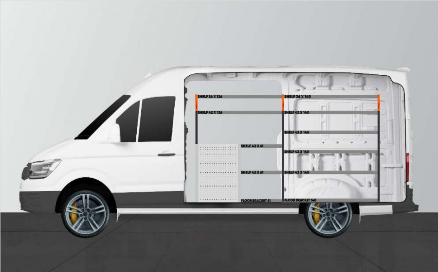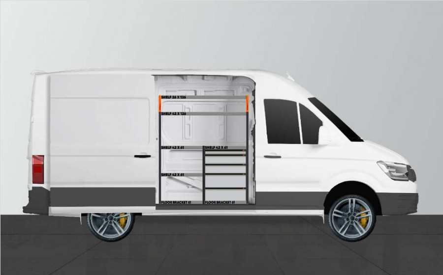 Dit is een van de populairste systemen voor de laadruimte van de MAN TGE & Volkswagen Crafter L3 met een zijdeur naast de zijkant van de bedrijfswageninrichting. De bedrijfswageninrichting biedt goede opbergmogelijkheden voor zowel assortiment koffers, gereedschappen en kleine materialen. U krijgt een ladeblok met een aantal in verschillende afmetingen, zodat alles zijn eigen plek krijgt. Naast de lades is een gereedschapshouder aangebracht voor extra ophangmogelijkheden in de laadruimte. De lades op geleiders met kogellagers worden vaak aangevuld met onze inzetstukken en ladeverdelers om een optimale indeling te creëren. Het aanvullen van het eindstuk met onze smartbox is ook een populaire optie om de opbergruimte te optimaliseren.