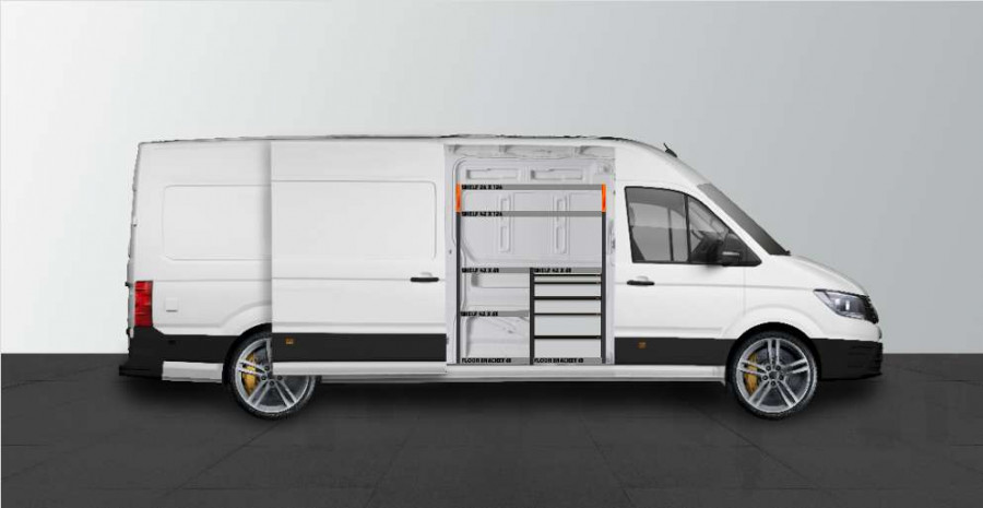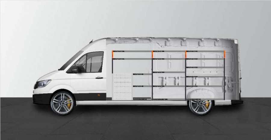 Dit is een van de populairste systemen voor de laadruimte van de MAN TGE & Volkswagen Crafter L4 met een zijdeur naast de zijkant van de bedrijfswageninrichting. De bedrijfswageninrichting biedt goede opbergmogelijkheden voor zowel assortiment koffers, gereedschappen en kleine materialen. U krijgt een ladeblok met een aantal in verschillende afmetingen, zodat alles zijn eigen plek krijgt. Naast de lades is een gereedschapshouder aangebracht voor extra ophangmogelijkheden in de laadruimte. De lades op geleiders met kogellagers worden vaak aangevuld met onze inzetstukken en ladeverdelers om een optimale indeling te creëren. Het aanvullen van het eindstuk met onze smartbox is ook een populaire optie om de opbergruimte te optimaliseren.