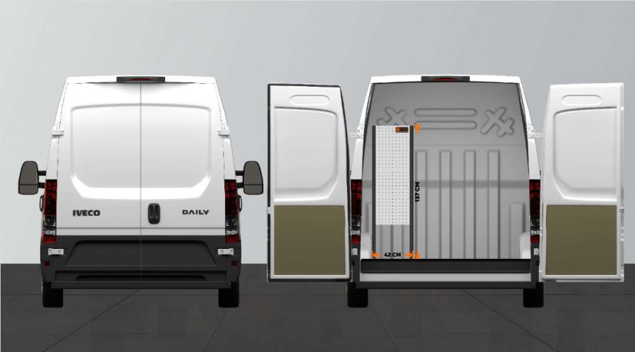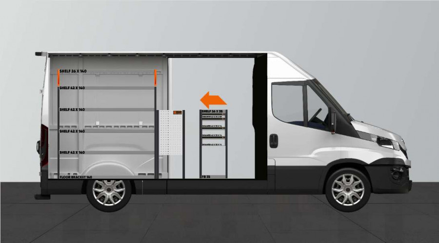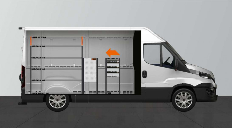 Een van de meest populaire bedrijfswageninrichting voor uw Iveco Daily L2. De bedrijfswageninrichting biedt uiteenlopende opbergmogelijkheden, omdat de lades op de lades op geleiders met kogellagers een handige toegang bieden via de zijdeur, terwijl deze lades in de rijrichting kunnen worden uitgetrokken voor een beter overzicht. De lades kunnen worden aangevuld met ladeverdelers om zoveel mogelijk structuur aan te brengen voor kleinere materialen. Onze diepe legplanken bieden ook goede opbergmogelijkheden voor gereedschapkoffers en gereedschappen. Het maximale verdeelde gewicht van de materialen in de lades op geleiders met kogellagers is 35 kg per lade. De binnen afmetingen van de lades zijn (mm) B-308, D-387, H-60 en H-130.