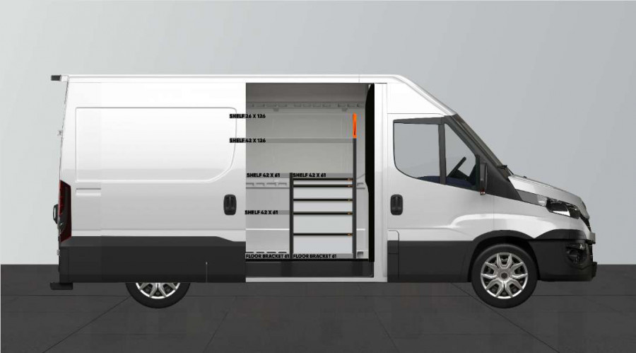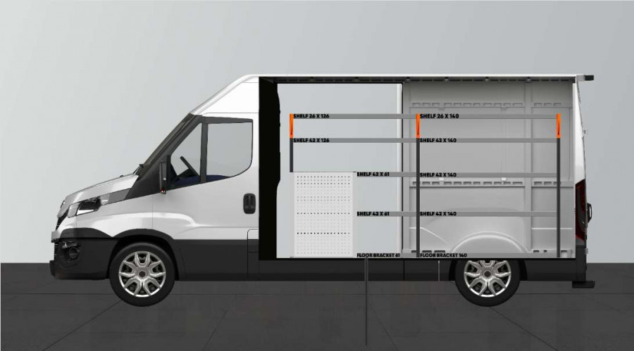 Dit is een van de populairste systemen voor de laadruimte van de Iveco Daily L2 met een zijdeur naast de zijkant van de bedrijfswageninrichting. De bedrijfswageninrichting biedt goede opbergmogelijkheden voor zowel assortiment koffers, gereedschappen en kleine materialen. U krijgt een ladeblok met een aantal in verschillende afmetingen, zodat alles zijn eigen plek krijgt. Naast de lades is een gereedschapshouder aangebracht voor extra ophangmogelijkheden in de laadruimte. De lades op geleiders met kogellagers worden vaak aangevuld met onze inzetstukken en ladeverdelers om een optimale indeling te creëren. Het aanvullen van het eindstuk met onze smartbox is ook een populaire optie om de opbergruimte te optimaliseren.
