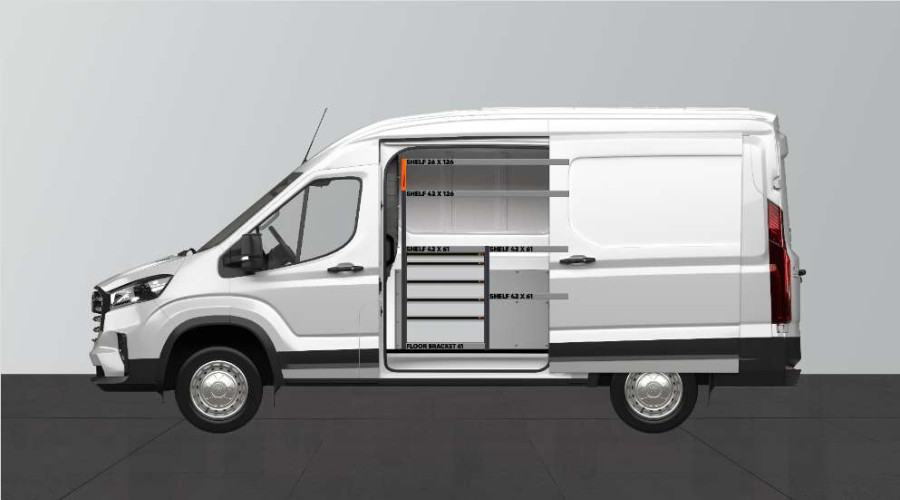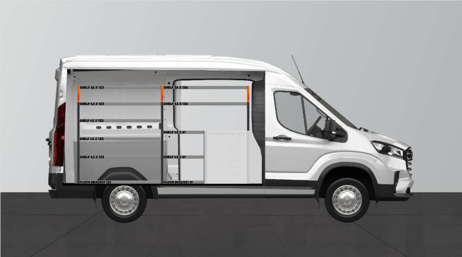Dit is een van de populairste systemen voor de laadruimte van de Maxus e-Deliver 9 L2 met een zijdeur naast de zijkant van de bedrijfswageninrichting. De bedrijfswageninrichting biedt goede opbergmogelijkheden voor zowel assortiment koffers, gereedschappen en kleine materialen. U krijgt een ladeblok met een aantal in verschillende afmetingen, zodat alles zijn eigen plek krijgt. Naast de lades is een gereedschapshouder aangebracht voor extra ophangmogelijkheden in de laadruimte. De lades op geleiders met kogellagers worden vaak aangevuld met onze inzetstukken en ladeverdelers om een optimale indeling te creëren. Het aanvullen van het eindstuk met onze smartbox is ook een populaire optie om de opbergruimte te optimaliseren.