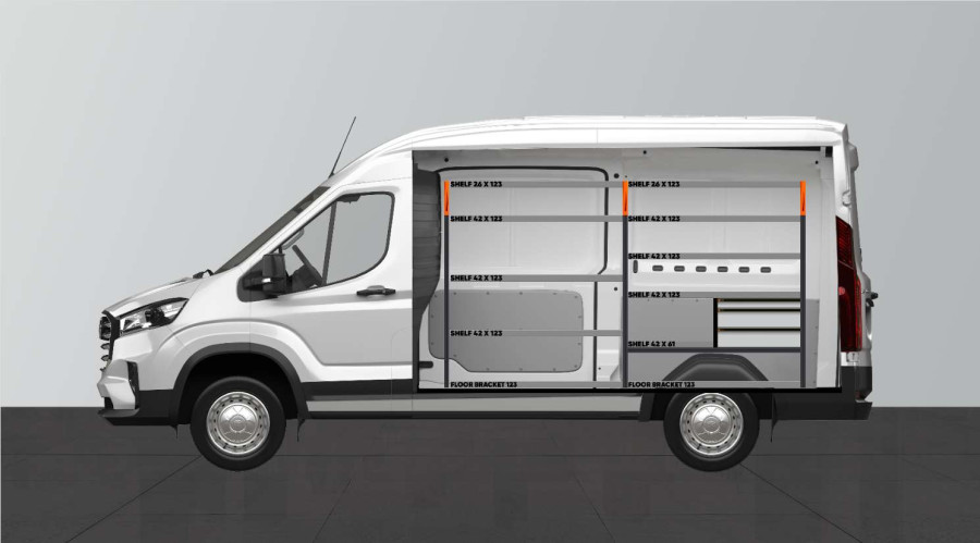Dit is een van onze populairste bedrijfswageninrichtingen voor de laadruimte van uw Maxus e-Deliver 9 L2. De LS3 bedrijfswageninrichting wordt gebruikt door zowel installateurs, onderhoudsmonteurs en klusbedrijven. De bedrijfswageninrichting biedt goede opbergmogelijkheden voor assortiment koffers, gereedschappen, gebruiksmaterialen en kleine materialen. De lades worden vaak aangevuld met inzetstukken en ladeverdelers terwijl het gereedschapspaneel van het eindstuk populair is om aan te vullen met een smartbox om de opbergruimte te optimaliseren.