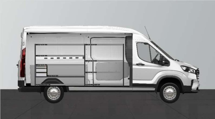 Een voordelig alternatief voor mensen met een eenvoudigere behoefte aan opbergruimte die een combinatie willen van lades op geleiders met kogellagers en maar ook legplanken voor hun laadruimte in de Maxus e-Deliver9 L3. De bedrijfswageninrichting is 420 mm diep, waardoor de meeste assortiment koffers die er op de markt zijn perfect passen. De lades zijn aan te vullen met inzetstukken en ladeverdelers, wat het mogelijk maakt kleine onderdelen overzichtelijk op te bergen.