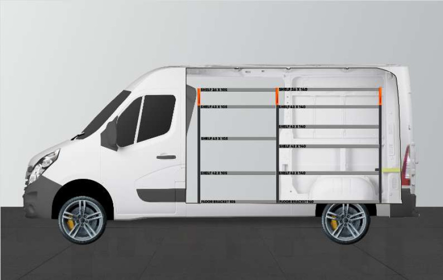 Een bedrijfswageninrichting voor de laadruimte van uw Opel Movano, Renault Master och Nissan NV400 met goede opbergmogelijkheden voor zowel assortiment koffers, gereedschappen en kleine onderdelen. De legplanken van de bedrijfswageninrichting met een diepte van 420 mm zorgen ervoor dat de meeste assortiment koffers die er op de markt zijn perfect passen De bovenste plank van 262,5 mm wordt vaak aangevuld met onze modulaire magazijnbakken om kleinere onderdelen een plekje te geven. De gereedschapshouder op het eindstuk is aan te vullen met extra accessoires, zoals haken of een smartbox.