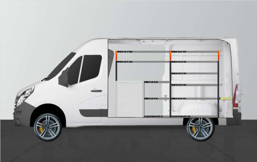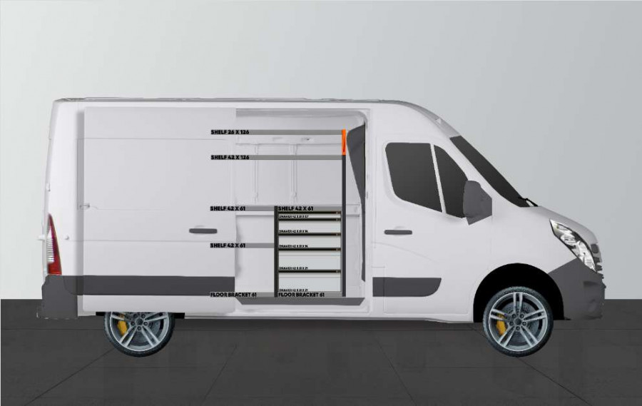 Dit is een van de populairste systemen voor de laadruimte van de Opel Movano, Renualt Master & Nissan NV400 met een zijdeur naast de zijkant van de bedrijfswageninrichting. De bedrijfswageninrichting biedt goede opbergmogelijkheden voor zowel assortiment koffers, gereedschappen en kleine materialen. U krijgt een ladeblok met een aantal in verschillende afmetingen, zodat alles zijn eigen plek krijgt. Naast de lades is een gereedschapshouder aangebracht voor extra ophangmogelijkheden in de laadruimte. De lades op geleiders met kogellagers worden vaak aangevuld met onze inzetstukken en ladeverdelers om een optimale indeling te creëren. Het aanvullen van het eindstuk met onze smartbox is ook een populaire optie om de opbergruimte te optimaliseren.