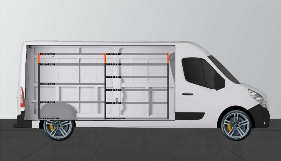 Een bedrijfswageninrichting voor de laadruimte van uw Opel Movano, Renault Master & Nissan NV400 L3 met goede opbergmogelijkheden voor zowel assortiment koffers, gereedschappen en kleine onderdelen. De legplanken van de bedrijfswageninrichting met een diepte van 420 mm zorgen ervoor dat de meeste assortiment koffers die er op de markt zijn perfect passen De bovenste plank van 262,5 mm wordt vaak aangevuld met onze modulaire magazijnbakken om kleinere onderdelen een plekje te geven. De gereedschapshouder op het eindstuk is aan te vullen met extra accessoires, zoals haken of een smartbox.