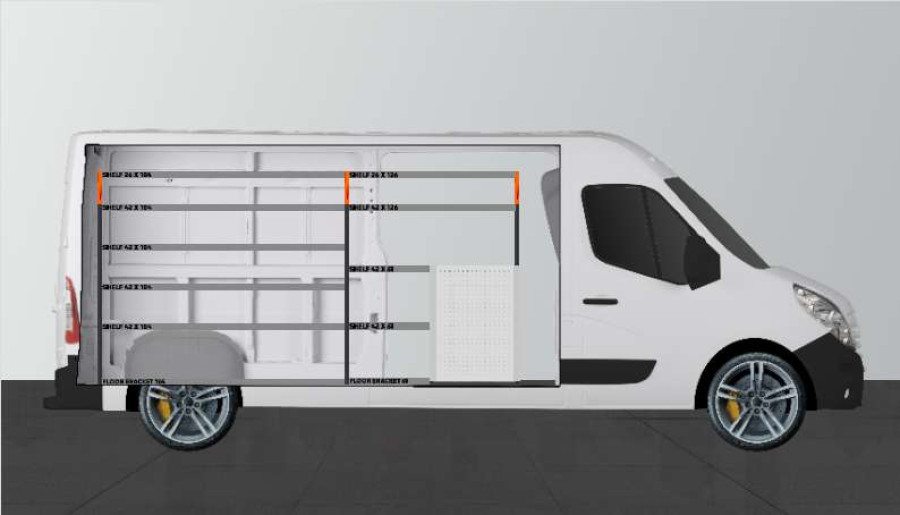 Dit is een van de populairste systemen voor de laadruimte van de Opel Movano, Renault Master & Nissan NV400 L3 met een zijdeur naast de zijkant van de bedrijfswageninrichting. De bedrijfswageninrichting biedt goede opbergmogelijkheden voor zowel assortiment koffers, gereedschappen en kleine materialen. U krijgt een ladeblok met 5 aantal in verschillende afmetingen, zodat alles zijn eigen plek krijgt. Naast de lades is een gereedschapshouder aangebracht voor extra ophangmogelijkheden in de laadruimte. De lades op geleiders met kogellagers worden vaak aangevuld met onze inzetstukken en ladeverdelers om een optimale indeling te creëren. Het aanvullen van het eindstuk met onze smartbox is ook een populaire optie om de opbergruimte te optimaliseren.