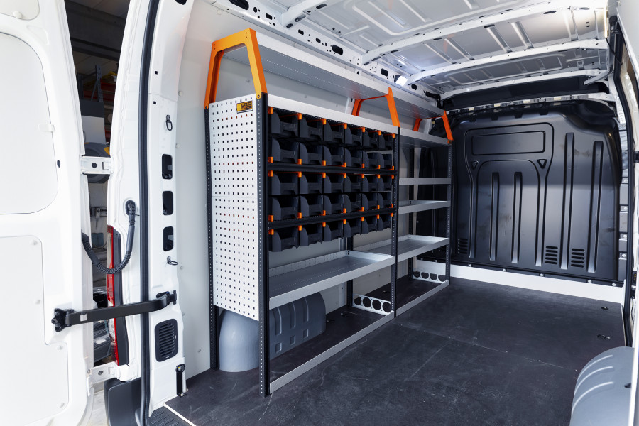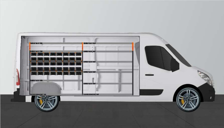 RACK is een nieuwe, toonaangevende bedrijfswageninrichting voor in de laadruimte van de Opel Movano, Renault Master & Nissan NV400. Dit is de perfecte oplossing voor wie goede opbergmogelijkheden nodig heeft voor kleine materiaal zoals schroeven, koppelingen, bouten, boren en moeren. De bedrijfswageninrichting is geoptimaliseerd met in totaal 80 van onze nieuwe, verdeelbare modulaire magazijn bakken. De modulaire magazijn bakken worden op vaste rails uitgetrokken en zijn zo gemakkelijk toegankelijk. De voorzijde van de modulaire magazijn bakken is ontworpen voor een optimale toegankelijkheid en kan worden aangevuld met transparante fronten en verdelers, die om de 60 mm kunnen worden geplaatst.