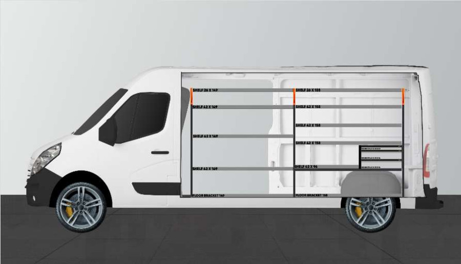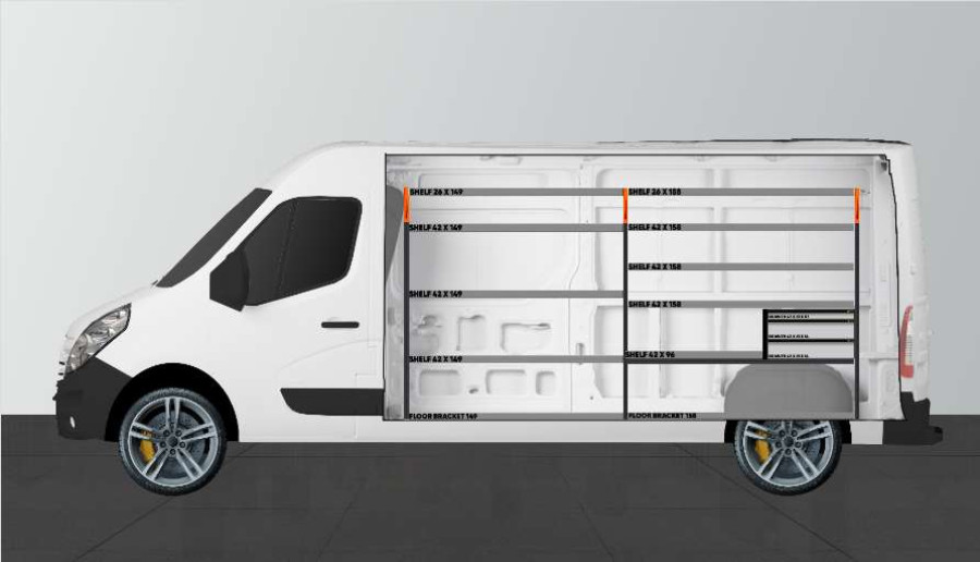 Dit is een van onze populairste bedrijfswageninrichtingen voor de laadruimte van uw Opel Movano, Renault Master & Nissan NV400 L3. De LS3 bedrijfswageninrichting wordt gebruikt door zowel installateurs, onderhoudsmonteurs en klusbedrijven. De bedrijfswageninrichting biedt goede opbergmogelijkheden voor assortiment koffers, gereedschappen, gebruiksmaterialen en kleine materialen. De lades worden vaak aangevuld met inzetstukken en ladeverdelers terwijl het gereedschapspaneel van het eindstuk populair is om aan te vullen met een smartbox om de opbergruimte te optimaliseren.