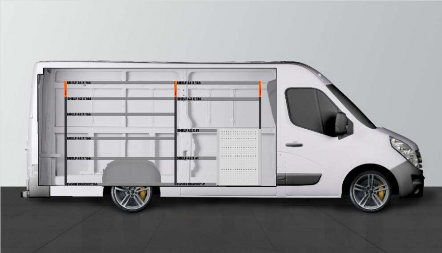 Dit is een van de populairste systemen voor de laadruimte van de Opel Movano, Renault Master & Nissan NV400 L3 met een zijdeur naast de zijkant van de bedrijfswageninrichting. De bedrijfswageninrichting biedt goede opbergmogelijkheden voor zowel assortiment koffers, gereedschappen en kleine materialen. U krijgt een ladeblok met een aantal in verschillende afmetingen, zodat alles zijn eigen plek krijgt. Naast de lades is een gereedschapshouder aangebracht voor extra ophangmogelijkheden in de laadruimte. De lades op geleiders met kogellagers worden vaak aangevuld met onze inzetstukken en ladeverdelers om een optimale indeling te creëren. Het aanvullen van het eindstuk met onze smartbox is ook een populaire optie om de opbergruimte te optimaliseren.