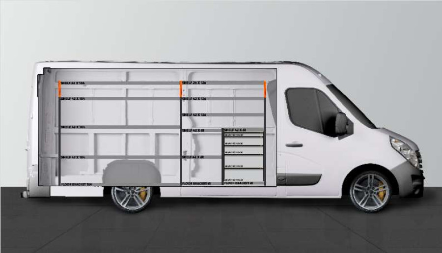 Deze bedrijfswageninrichting biedt veel opbergruimte met zowel legplanken als lades, geschikt voor de Movano, Master & NV400 L3.