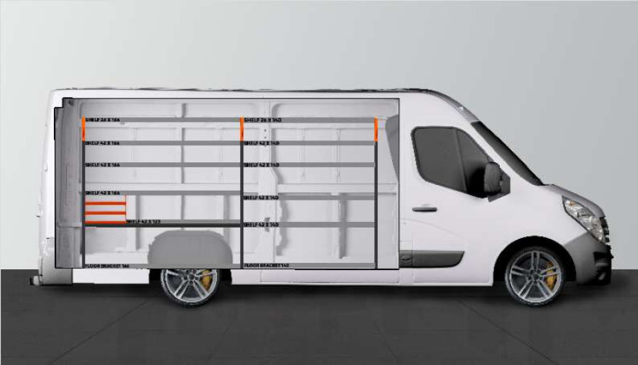 Bedrijfswageninrichting voor wie assortimentstassen in de Movano, Master & NV400 L3 gebruikt.