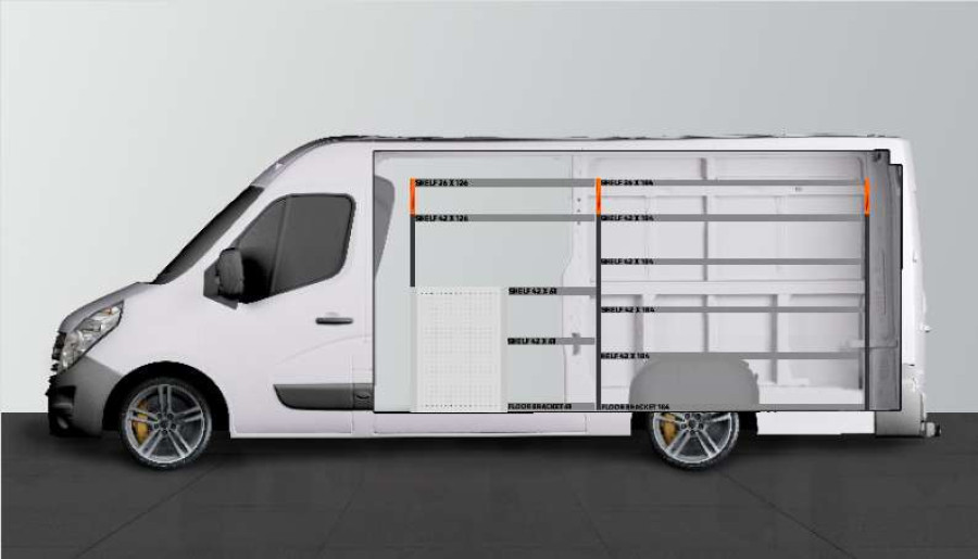 Dit is een van de populairste systemen voor de laadruimte van de Opel Movano, Renault Master & Nissan NV400 L3 met een zijdeur naast de zijkant van de bedrijfswageninrichting. De bedrijfswageninrichting biedt goede opbergmogelijkheden voor zowel assortiment koffers, gereedschappen en kleine materialen. U krijgt een ladeblok met een aantal in verschillende afmetingen, zodat alles zijn eigen plek krijgt. Naast de lades is een gereedschapshouder aangebracht voor extra ophangmogelijkheden in de laadruimte. De lades op geleiders met kogellagers worden vaak aangevuld met onze inzetstukken en ladeverdelers om een optimale indeling te creëren. Het aanvullen van het eindstuk met onze smartbox is ook een populaire optie om de opbergruimte te optimaliseren.