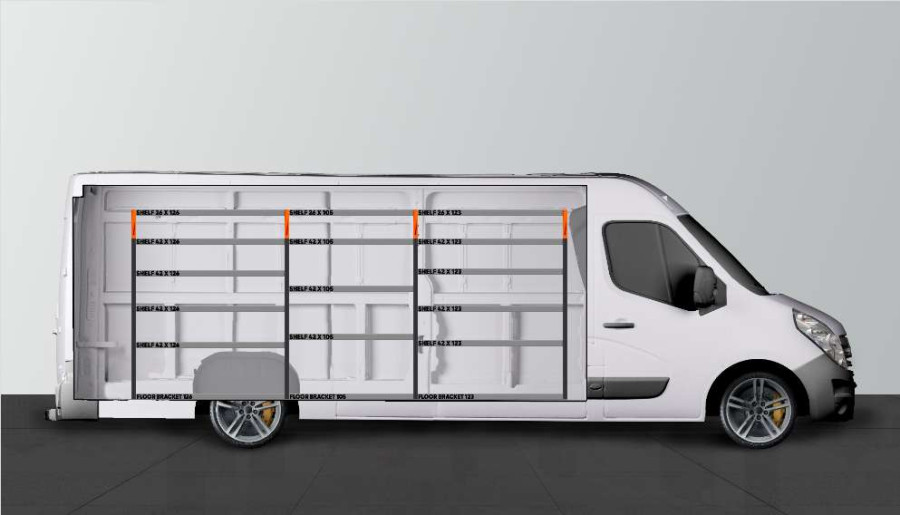 De V-Basic is geschikt voor diegene die het basismodel van het stellingsysteem met planken wil voor de linkerkant van de bedrijfswagen. Deze bedrijfswageninrichting is geschikt voor de Movano, Master & NV400 L4.