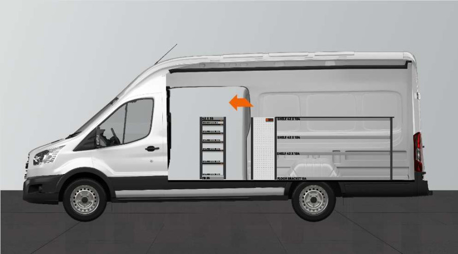 Bilinredning med arbetsbänk med hyllförvaring och utdragbara lådor till Ford Transit L4H3.