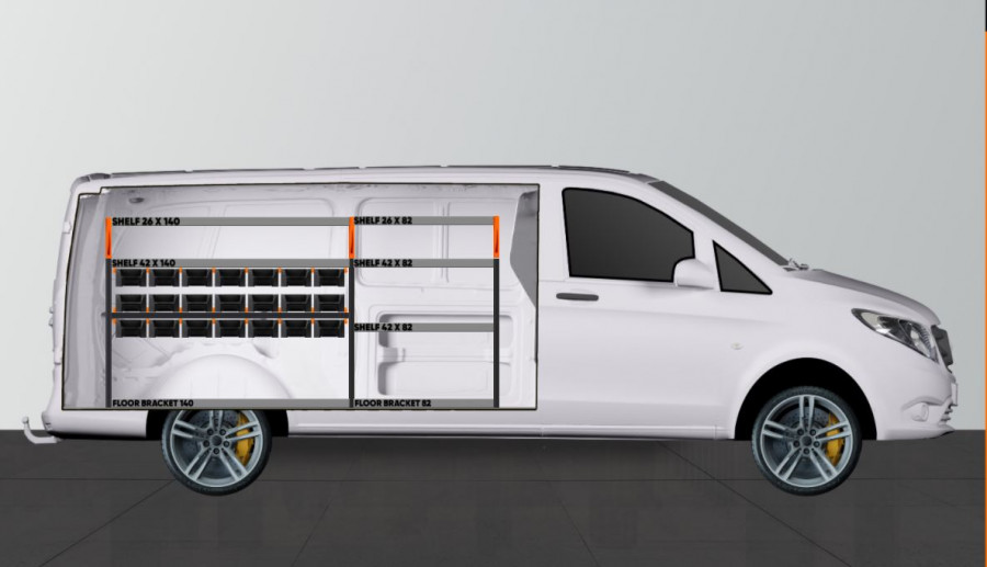 V-Rack is een nieuwe, branche leidende bedrijfswageninrichting. Het past perfect bij u wanneer u veel opslagmogelijkheden zoekt voor kleiner assortiment, zoals schroeven, koppelingen, bouten, boortjes en meer. Deze inrichting is geoptimaliseerd met 21 st nieuwe, deelbare modulebakken. De modulebakken kunnen naar voren gehaald worden over de rails, zodat u overal makkelijk bij kunt komen. De voorkant van het systeem is ontworpen om gemakkelijk toegang te bieden en kan uitgebreid worden met een transparante voorkant en dwarsliggende tussenpanelen die na elke 60mm geplaatst kunnen worden. De inrichting is passend voor de Mercedes Vito Extra Lang, en zoals voor elke bedrijfswageninrichting van ons geldt, is dit tegen de beste prijs op de markt.