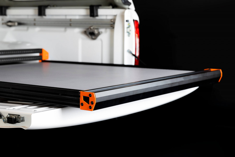Optimaliseer uw reikwijdte in uw laadruimte met een uitschuifbare bedslide. Optimaliseert uw werkomgeving omdat ze u de mogelijkheid biedt zware ladingen, zoals gereedschap, uit de auto te kunnen trekken en op een ergonomisch verantwoorde manier op te tillen. De volledige constructie is gemaakt van zwart geanodiseerd aluminium met een hoge treksterkte en gepoedercoate stalen bevestigingsmiddelen. Dankzij het zeer lage gewicht is de invloed op het totale gewicht beperkt. Met een totaal modulair concept kunnen we u de bedslide aanbieden die specifiek is gemaakt voor uw voertuig en uw behoeften. De bedslide kan eenvoudig met één hand worden verwijderd door de vergrendelknop in te drukken terwijl u de bedslide uitschuift. De bedslide kan snel worden gestopt tijdens het laden dankzij de veervergrendelingen en de verschillende stappen over de volledige uitschuiflengte, zelfs als de auto op een helling staat. U kunt een keuze maken uit een brede waaier van accessoires bij uw bedslide voor een volledige inrichting.